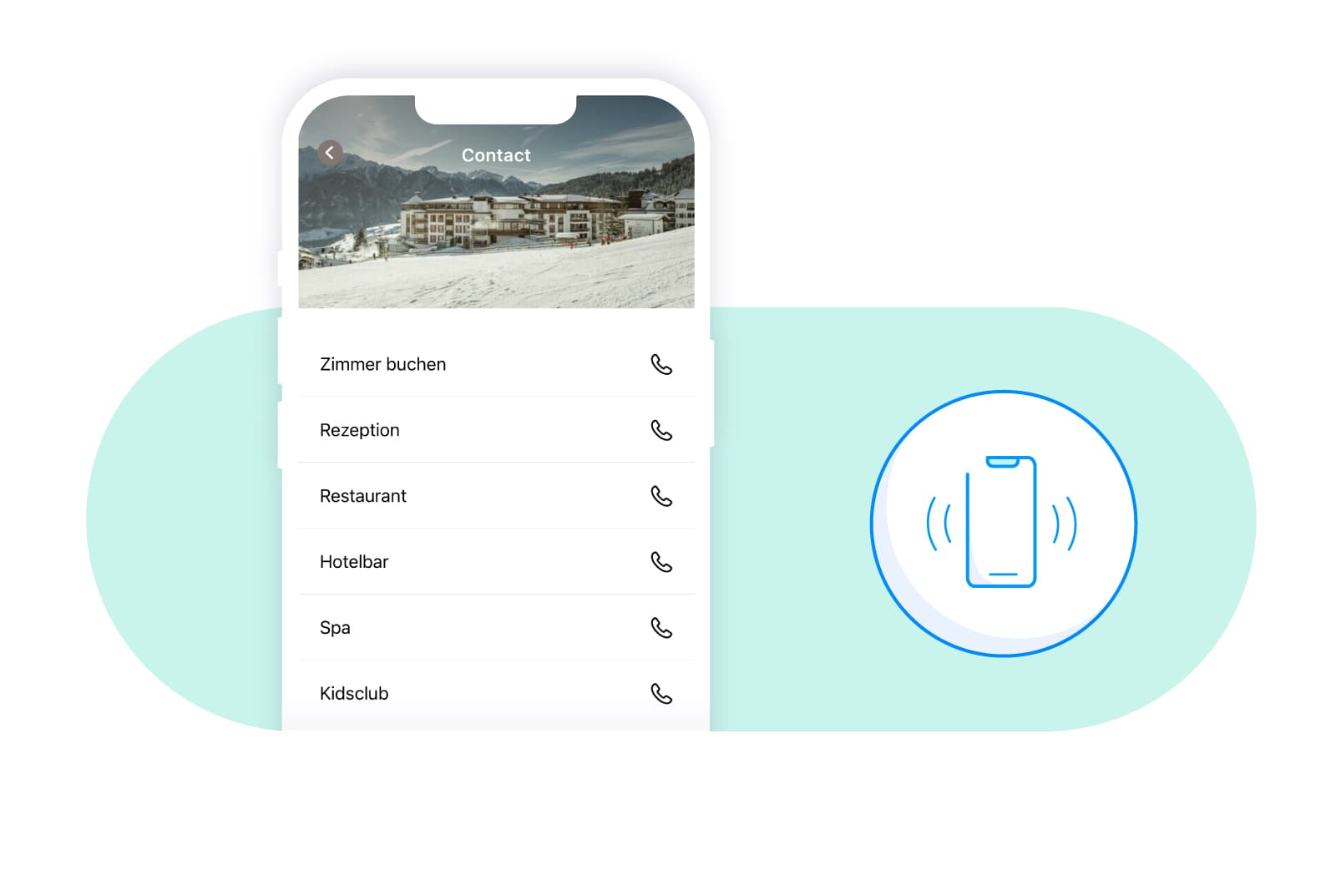 The native apps from Hotel MSSNGR have a prominent telephone directory. This function is always at hand and enables guests to contact the hotel during the entire customer journey. Be it before arrival to contact the concierge desk, during your stay or to make the next booking after your stay.