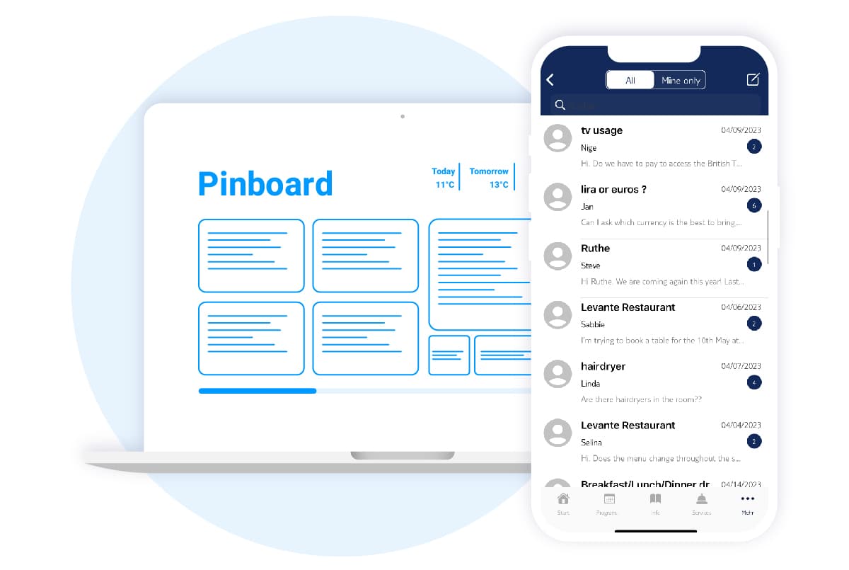 Hotel MSSNGR’s native apps are provided in white label versions. App icons, app store texts, app splash screens, colors and fonts are adapted to the appearance of the hotel. Hotel MSSNGR apps integrate seamlessly into the hotel’s communication environment – as if they were tailor-made apps.