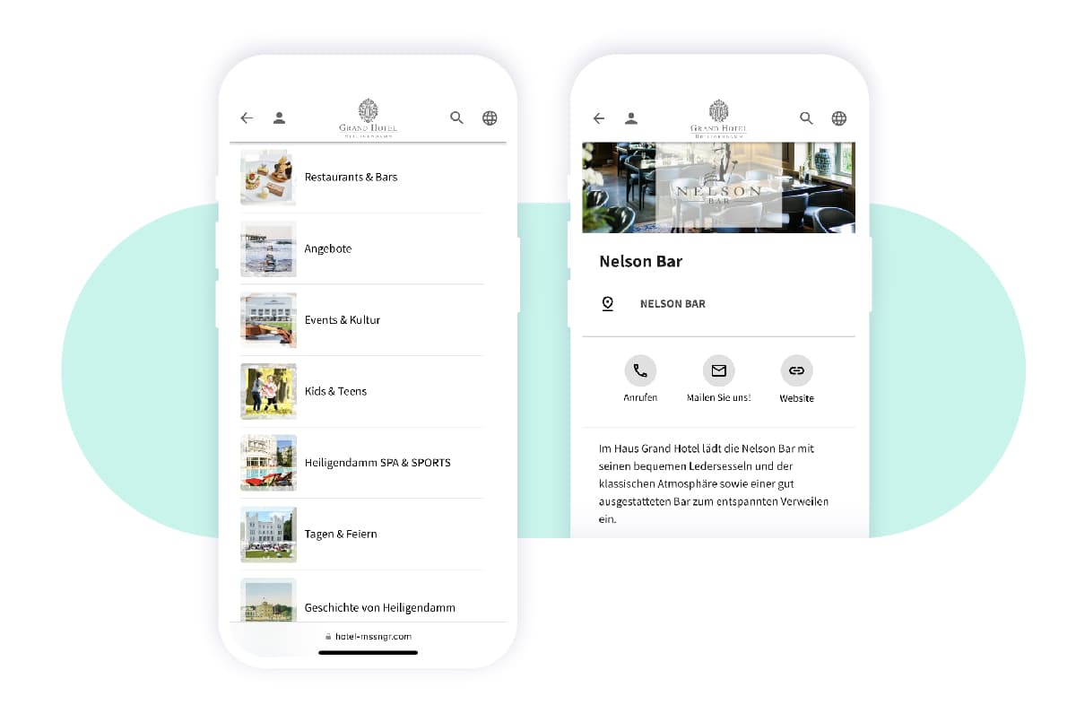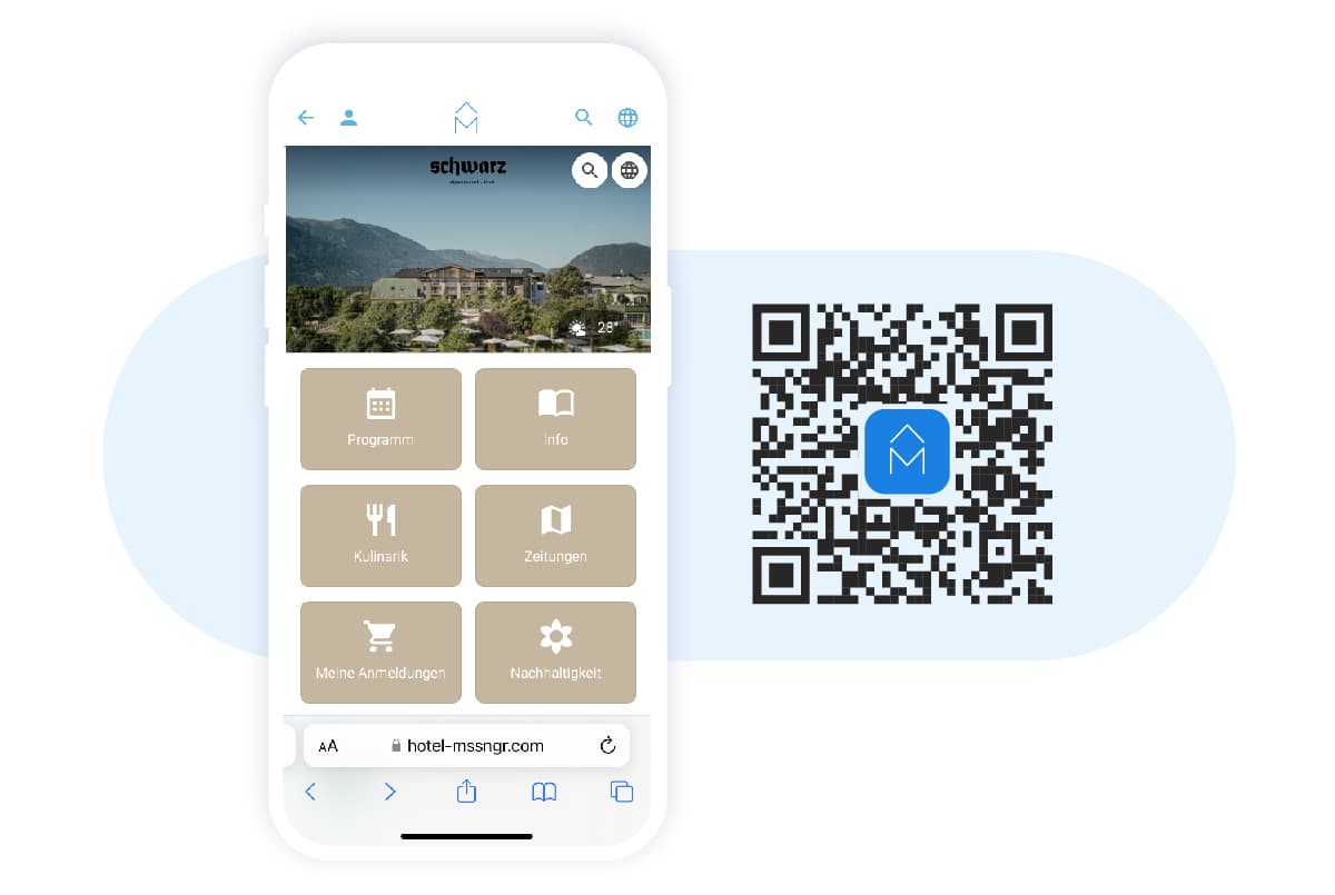 Hotel MSSNGR’s web app is the easy-to-use introduction to personalized guest communication – your entire Digital Hotel Information, accessible via QR Code or web link. Adapted to the corporate design of the hotel, it runs smoothly on all hardware and operating systems – no installation required.